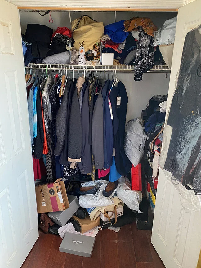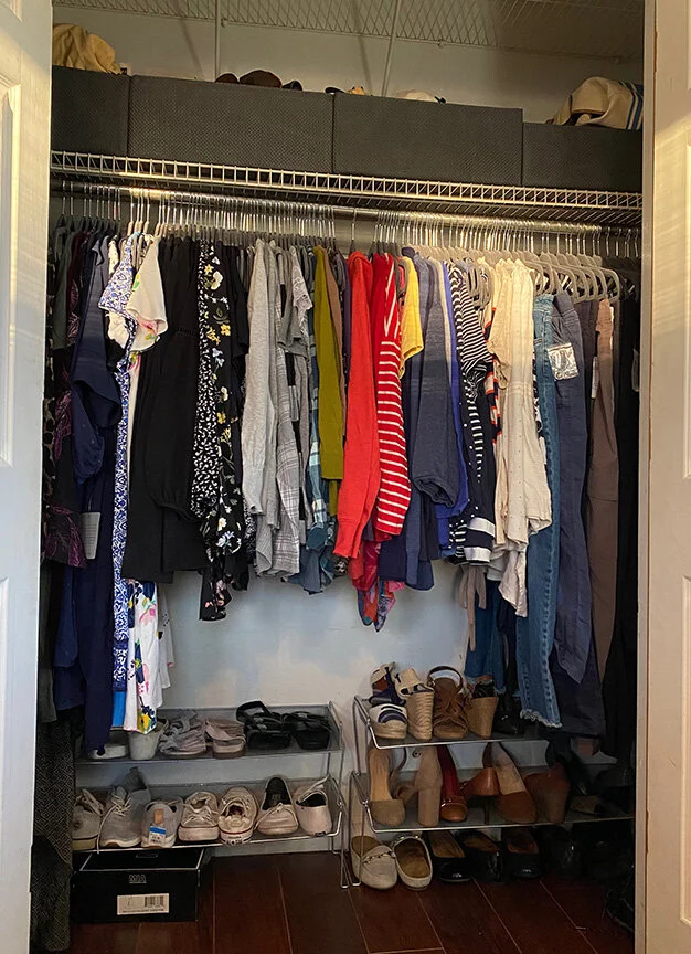 for this project we worked within the existing closet structure. adding new hangers, shoe racks, and boxes.