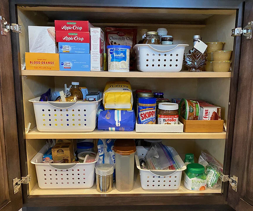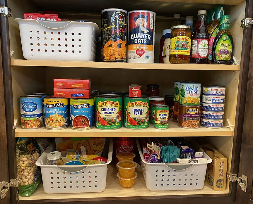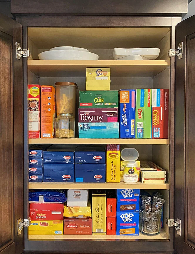 kitchen cabinets serve as the pantry in this home. items are categorized by end use. note all the baking items are together.