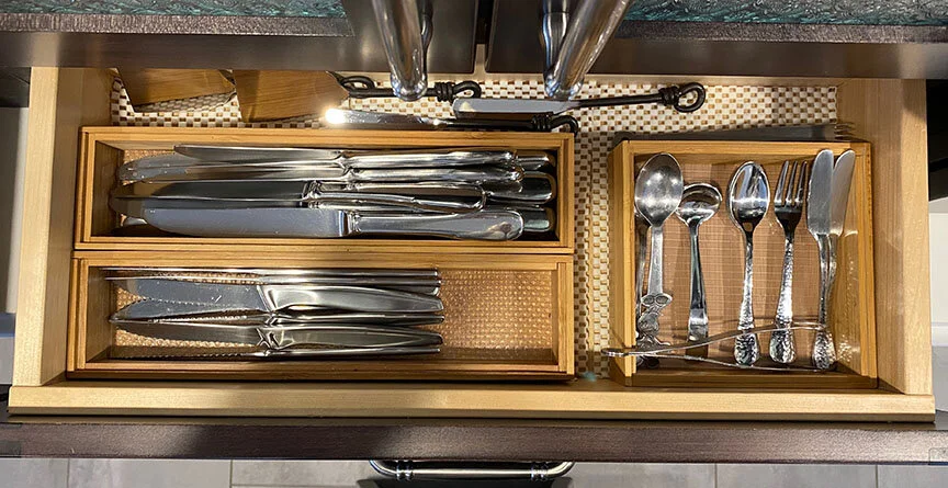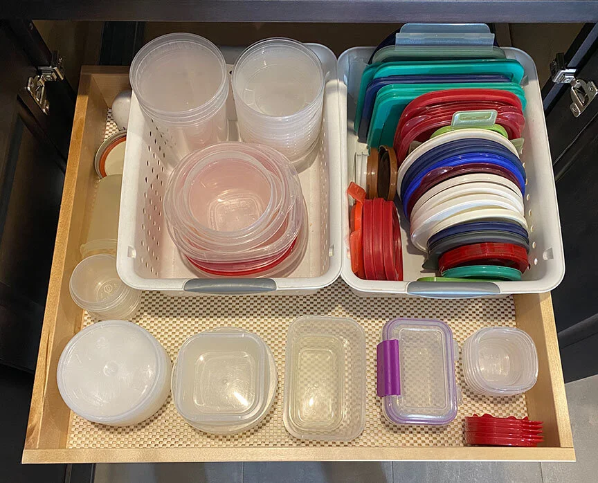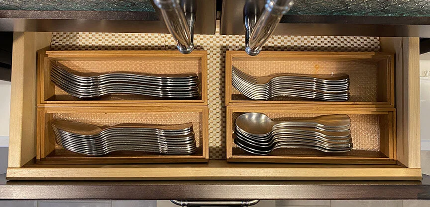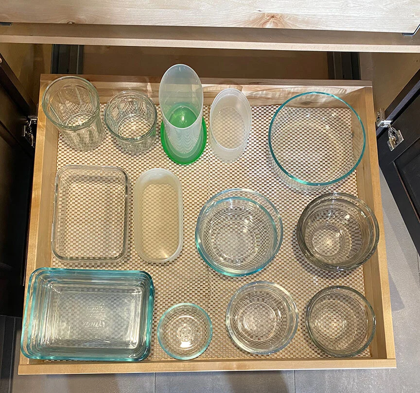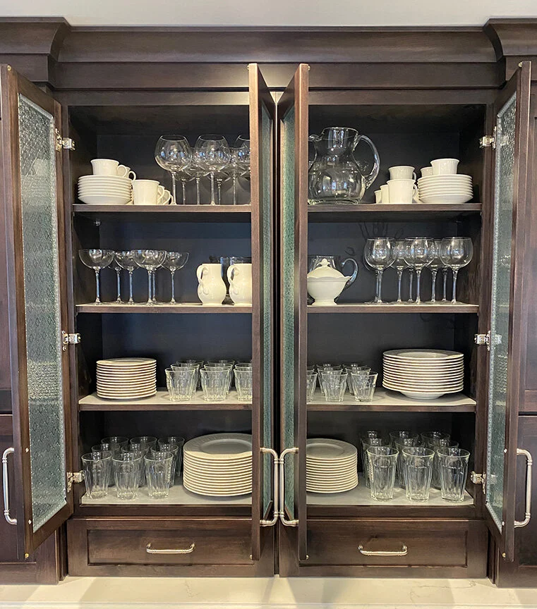 when organizing cabinets with glass doors remember everything is seen. so we balance placement for a pleasant presentation.